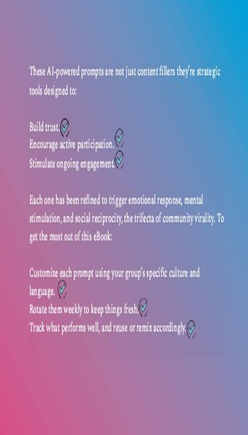 This eBook delivers high-performance AI prompt templates specifically engineered to: Spark vibrant, ongoing conversations, Generate fun, low-barrier activities that members want to participate in.